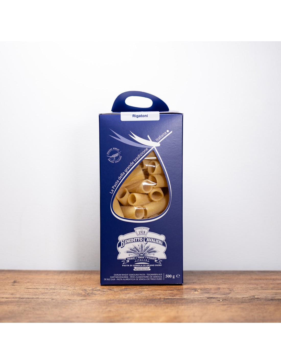 Premium Italian rigatoni pasta from Benedetto Cavalieri, made with durum wheat semolina using traditional slow-processing methods for excellent texture and flavour.